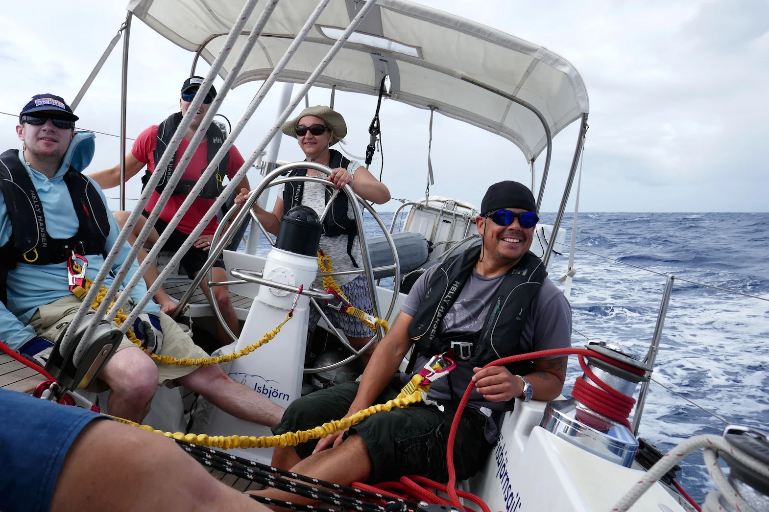 The rhumb line was only 90-some miles, but it was a long slog to windward. The trades were kicking, and we rarely saw less than 25 knots apparent, right on the nose, and more often it was closer to 30. Two reefs in the main and the small jib did Isbjorn just fine, and she crashed and bashed her way towards St. Barth’s and our planned landfall at Ile Fourche. That first little passage was baptism by fire for the crew. Kevin wasn’t 100%, feeling a tinge of mal-de-mar, and none of the gang had a great time down below, but they all seemed to love it! For Mia & I, it was a tough first trip, tiring, but we’d grown more and more comfortable knowing that Isbjorn, our Swan 48, can stand up to way more than we can, so when we were off watch, we both slept pretty darn well, despite the 25º of heel.